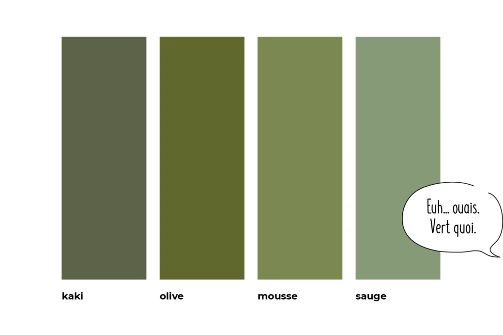 « Hum, pourquoi pas du kaki ? » « Ah nan, j’aime pas du tout, je préfère cette teinte olive. » « Vous avez pensé à un vert mousse ? » « Mouais, sinon la couleur sauge, ça serait pas mieux ? » 🌲