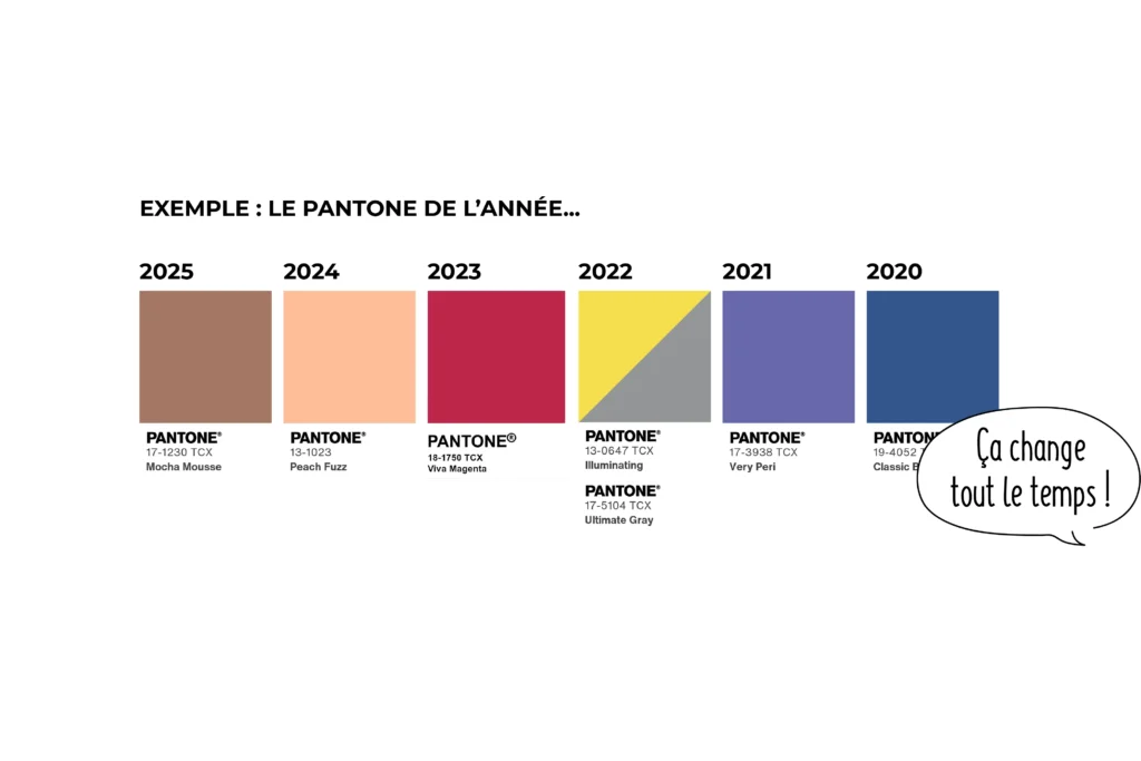 → Par contre, rien ne t’empêche de choisir la ou l’une des couleurs à la mode pour ta marque ou pour un événement. Il ne faut pas la choisir « juste parce qu’elle est cool en ce moment ». Tu dois réfléchir à ce qu’elle dégage, comme on l’a évoqué précédemment.