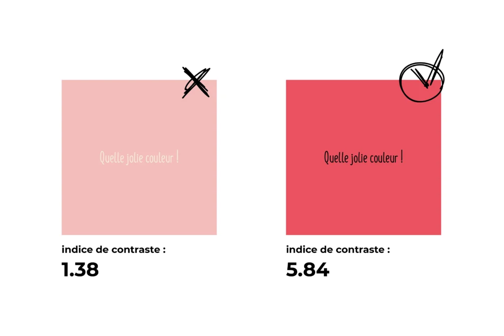 → P’tit tips en plus : il existe des sites faits pour calculer le contraste entre les teintes. Cela te permet d’offrir une lecture confortable à tes auditeurs, et ça, même en tout petit ! (on t’en parle plus bas, mais on va te spolier quand même, le site c’est : colourcontrast. Au minimum, on vise le 4.5 !