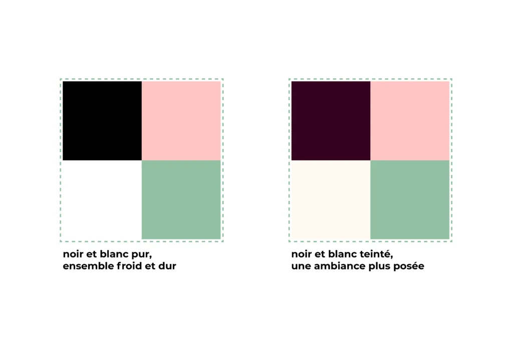 Dans une palette, on peut avoir besoin de mettre une couleur très foncée (pour pouvoir écrire sur la majorité des fonds colorés par exemple), ou prévoir d’utiliser le blanc du support d’origine, papier ou écran. Au lieu d’aller tout de suite prendre le choix de base, tu peux essayer d’utiliser une couleur foncée très saturée à la place du noir. Elle s’en approchera visuellement tout en véhiculant plus d’émotion, de profondeur… Et pareil pour le blanc, tu peux utiliser une couleur très très claire qui adoucira l’ensemble.