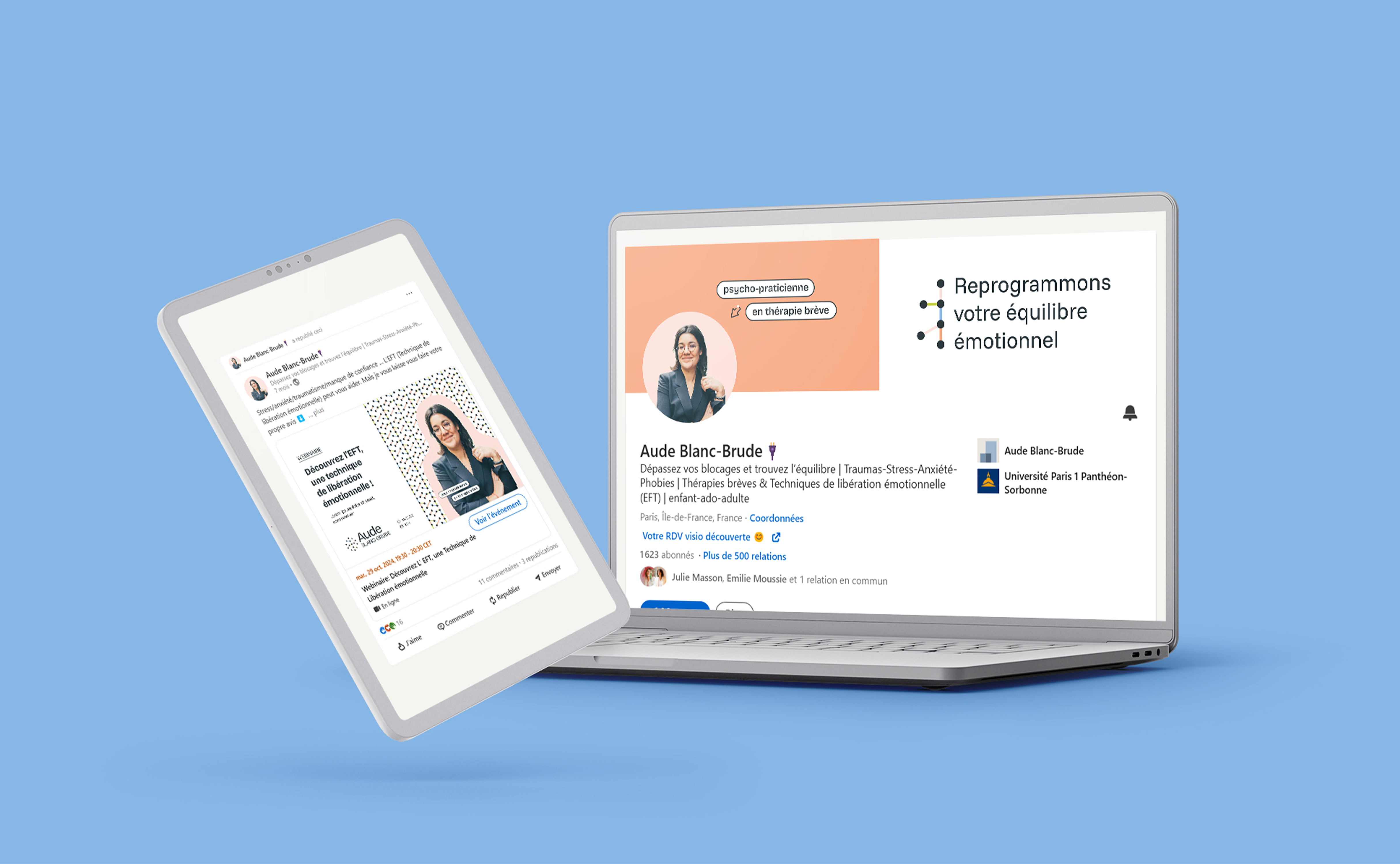 Aude communique beaucoup via Linkedin, et souhaite accroître sa visibilité avec une identité visuelle qui la représente mieux, et qui véhicule sa personnalité.
